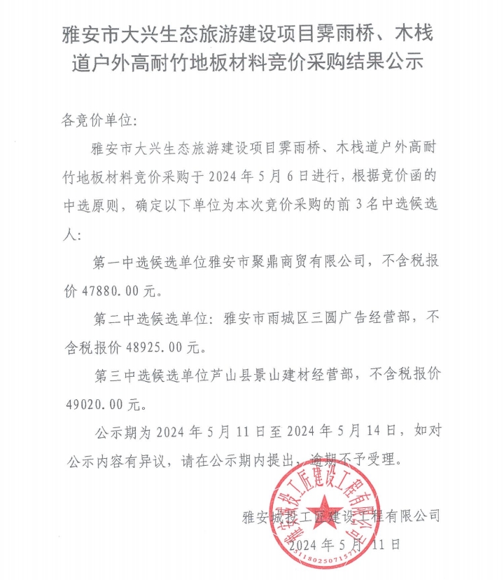 雅安市大興生態(tài)旅游建設(shè)項(xiàng)目霽雨橋、木棧道戶外高耐竹地板材料競(jìng)價(jià)采購結(jié)果公示