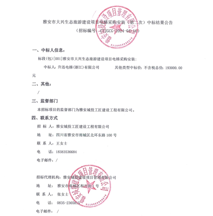 雅安市大興生態(tài)旅游建設(shè)項(xiàng)目電梯采購(gòu)安裝(第二次)中標(biāo)結(jié)果公告