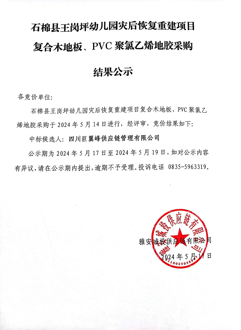 石棉縣王崗坪幼兒園災(zāi)后恢復(fù)重建項(xiàng)目復(fù)合木地板、PVC聚氯乙烯地膠采購結(jié)果公示