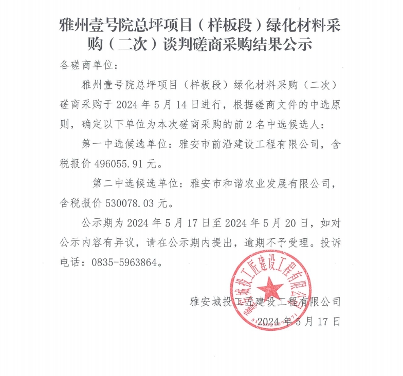 雅州壹號院總坪項(xiàng)目(樣板段)綠化材料采購 (二次)談判磋商采購結(jié)果公示