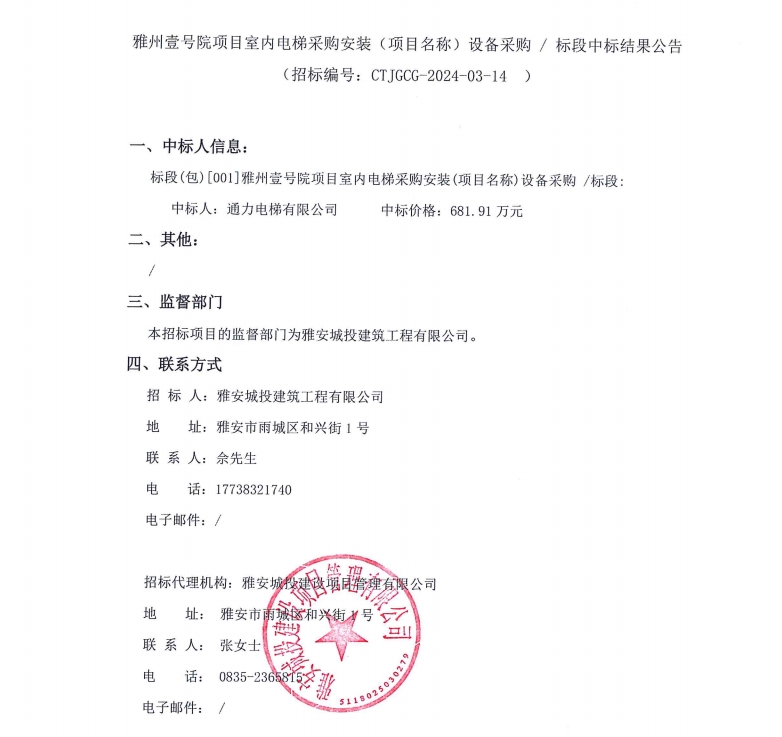 雅州壹號院項目室內(nèi)電梯采購安裝(項目名稱)設備采購/標段中標結果公告