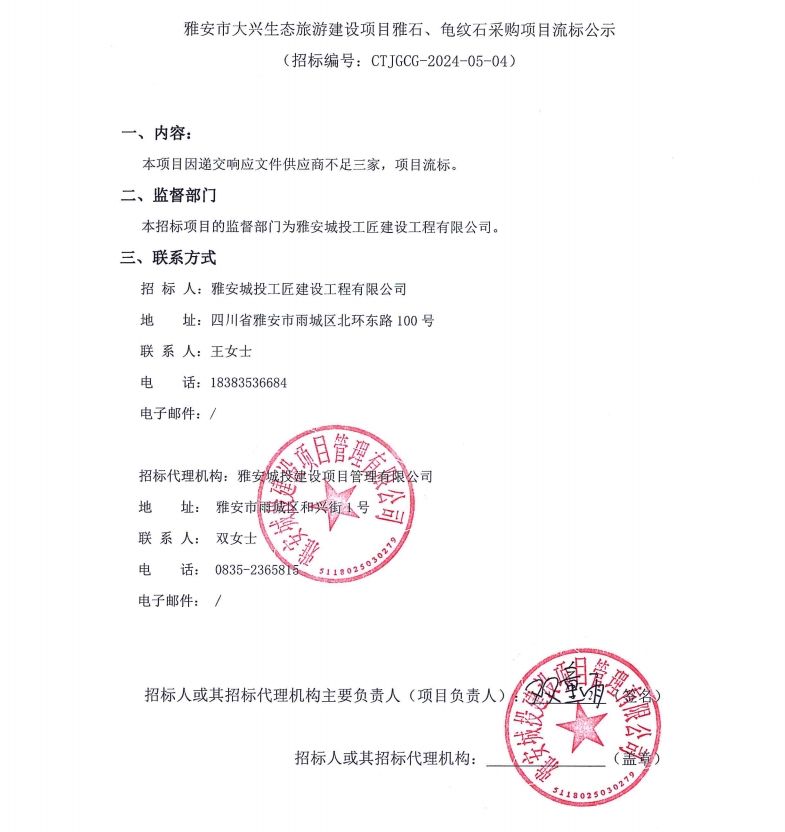 雅安市大興生態(tài)旅游建設(shè)項目雅石、龜紋石采購項目流標(biāo)公示