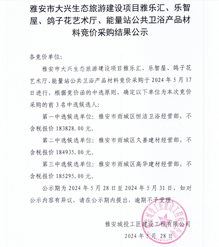 雅安市大興生態(tài)旅游建設(shè)項目雅樂匯、樂智屋、鴿子花藝術(shù)廳、能量站公共衛(wèi)浴材料競價采購結(jié)果公示