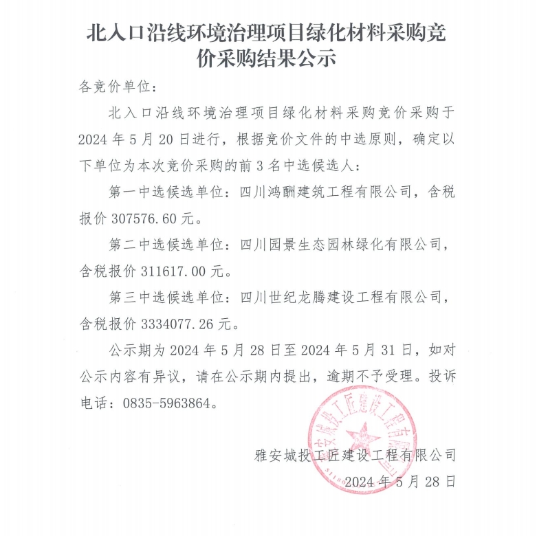 北入口沿線環(huán)境治理項目綠化材料采購競價采購結果公示