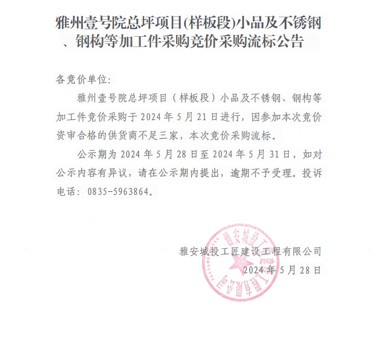 雅州壹號(hào)院總坪項(xiàng)目(樣板段)小品及不銹鋼、鋼構(gòu)等加工件采購(gòu)競(jìng)價(jià)采購(gòu)流標(biāo)公告