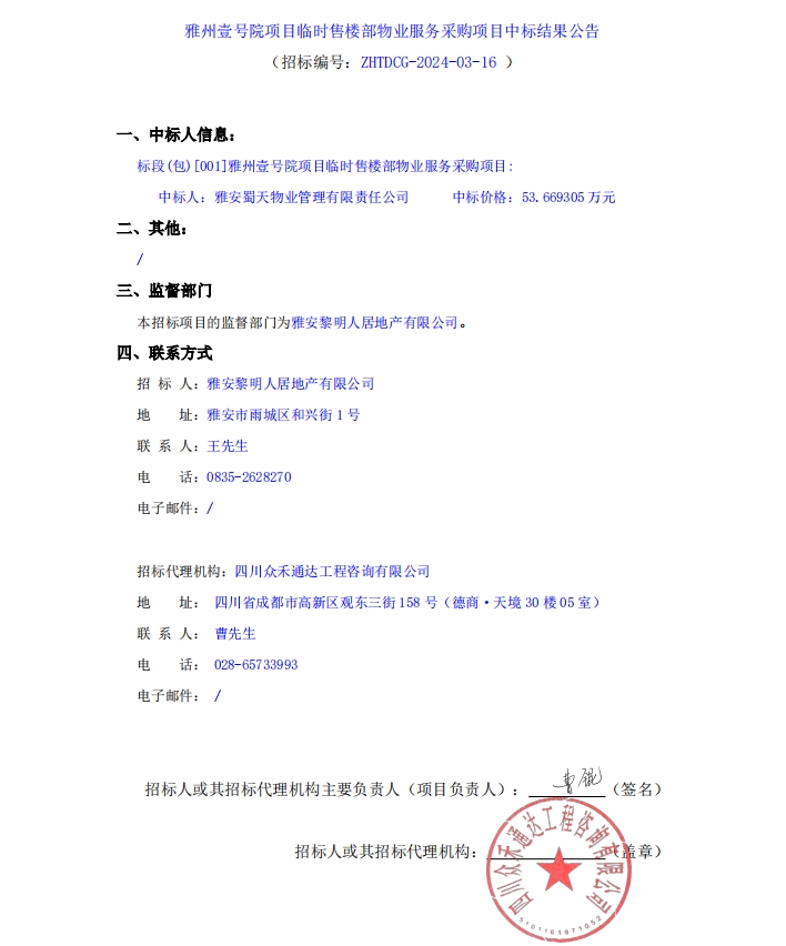 雅州壹號(hào)院項(xiàng)目臨時(shí)售樓部物業(yè)服務(wù)采購(gòu)項(xiàng)目中標(biāo)結(jié)果公告