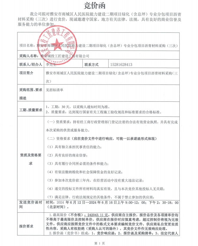 雅安市雨城區(qū)人民醫(yī)院能力建設(shè)二期項(xiàng)目綠化(含總坪)專(zhuān)業(yè)分包項(xiàng)目瀝青材料采購(gòu)(三次)競(jìng)價(jià)公告