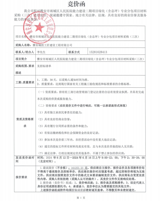 雅安市雨城區(qū)人民醫(yī)院能力建設(shè)二期項(xiàng)目綠化(含總坪)專業(yè)分包項(xiàng)目材料采購(三次)競價公告
