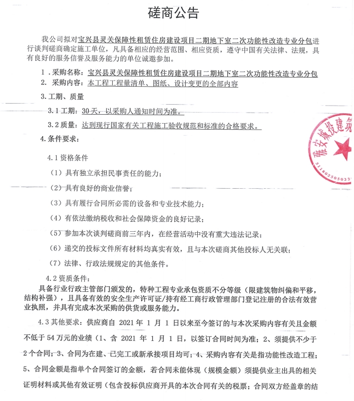 寶興縣靈關(guān)保障性租賃住房建設(shè)項(xiàng)目二期地下室二次功能性改造專(zhuān)業(yè)分包談判磋商公告
