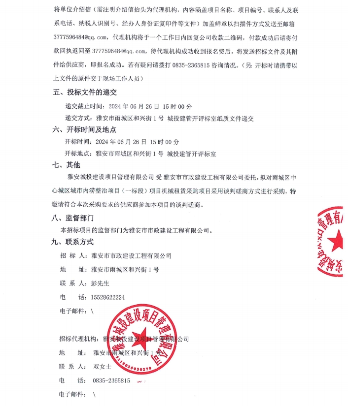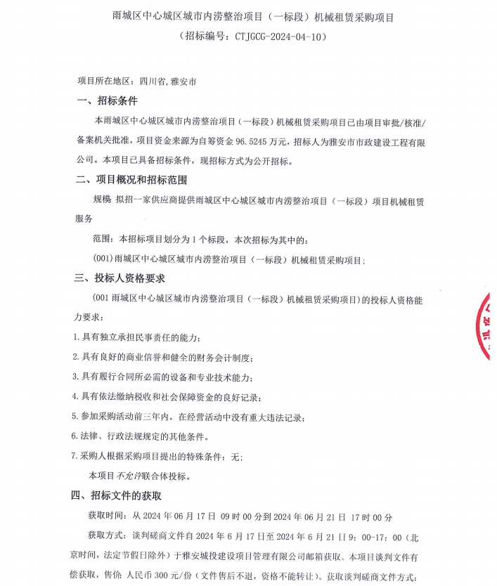 雨城區(qū)中心城區(qū)城市內(nèi)澇整治項(xiàng)目(一標(biāo)段)項(xiàng)目機(jī)械租賃采購項(xiàng)目招標(biāo)公告
