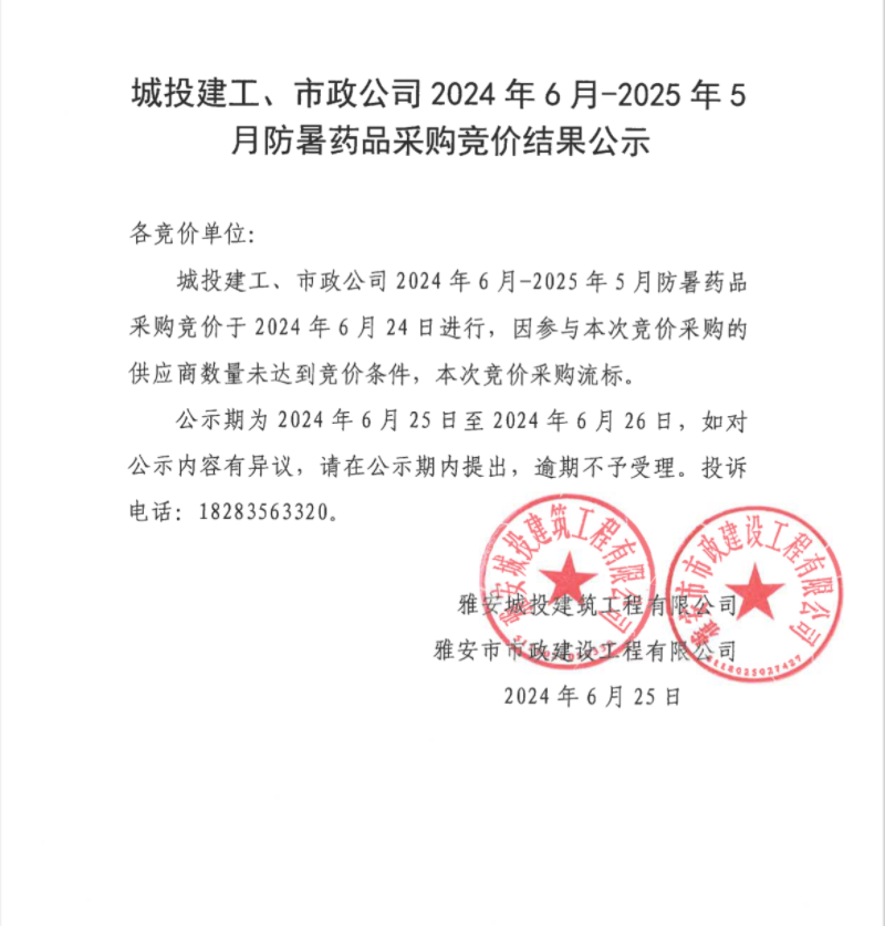 城投建工、市政公司2024年6月-2025年5月防暑藥品采購競價(jià)結(jié)果公示