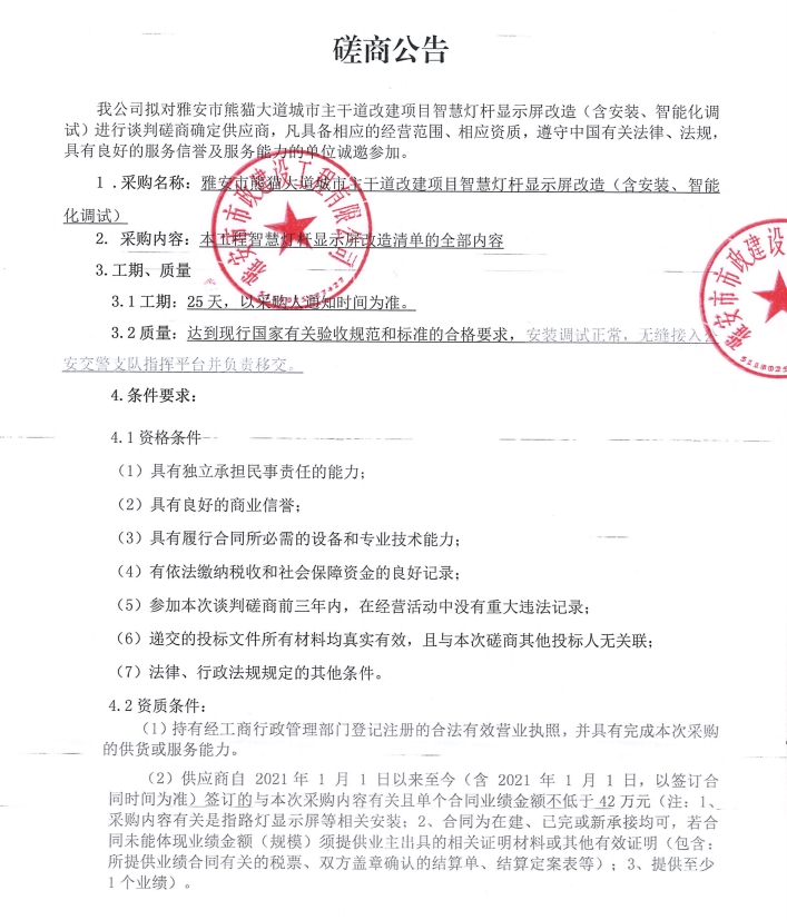 雅安市熊貓大道城市主干道改建項目智慧燈桿顯示屏改造(含安裝、智能化調試)磋商公告