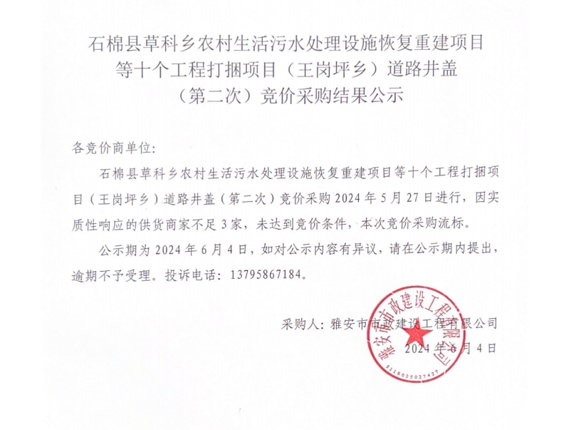 石棉縣草科鄉(xiāng)農村生活污水處理設施恢復重建項目等十個工程打捆項目(王崗坪鄉(xiāng))道路井蓋(第二次)競價采購結果公示