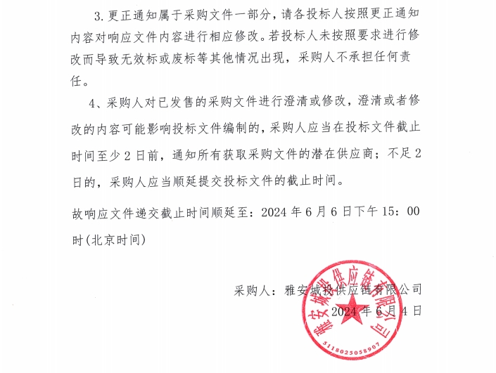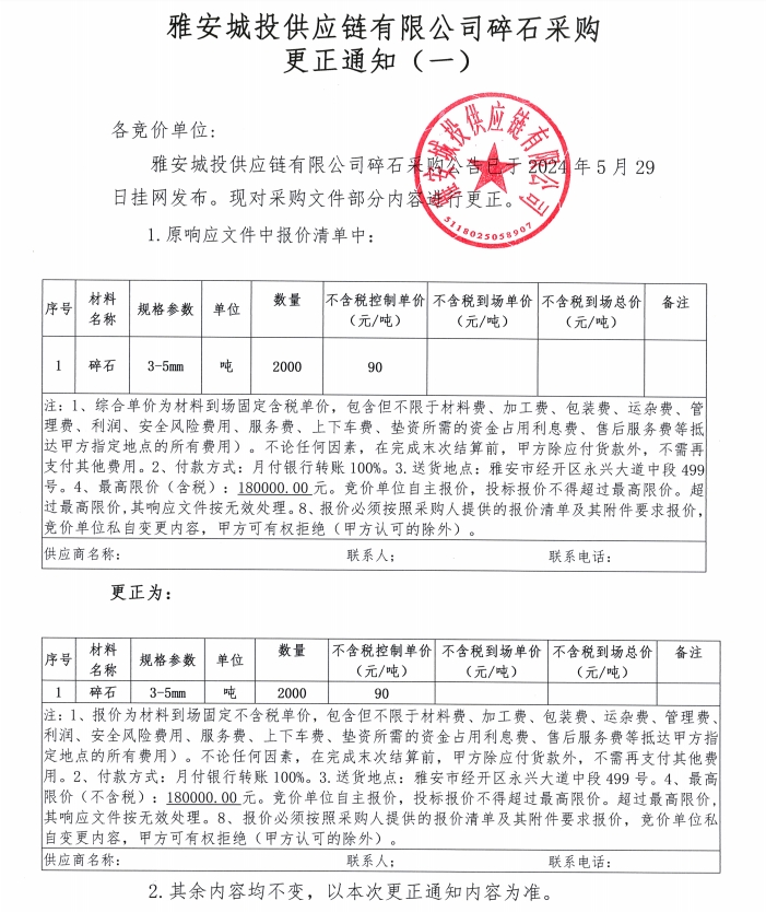 雅安城投供應(yīng)鏈有限公司碎石采購(gòu)更正通知(一)