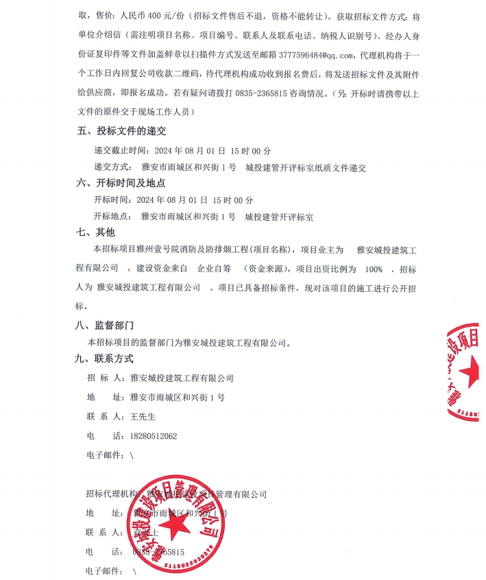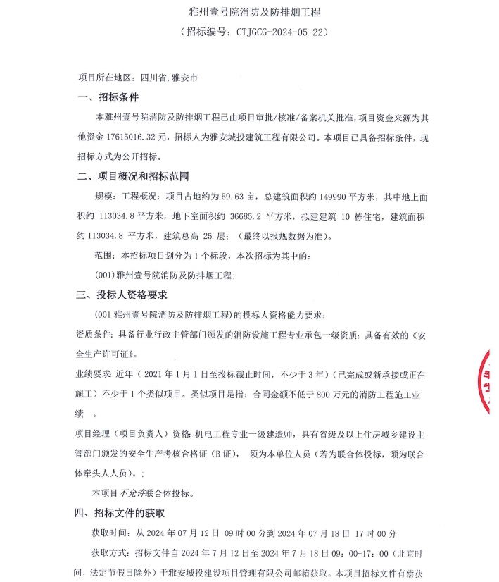 雅州壹號院項目消防及防排煙通風工程公告