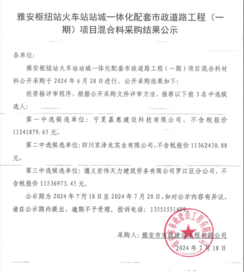 雅安樞紐站火車站站城一體化配套市政道路工程(一期)項目混合料采購結(jié)果公示