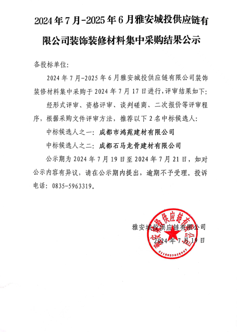 2024年7月-2025年6月雅安城投供應鏈有限公司裝飾裝修材料集中采購結果公示