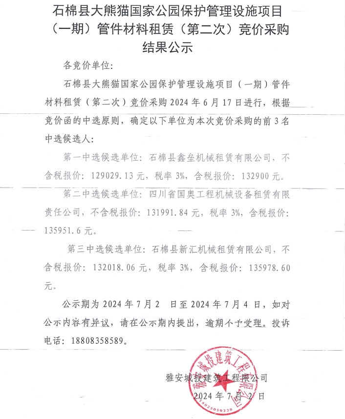 石棉縣大熊貓國家公園保護(hù)管理設(shè)施項目(一期)管件材料租賃(第二次)競價采購結(jié)果公示