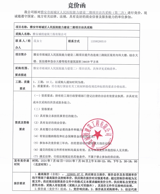 雅安市雨城區(qū)人民醫(yī)院能力建設(shè)二期項(xiàng)目潔具采購(gòu)(第二次)競(jìng)價(jià)公告
