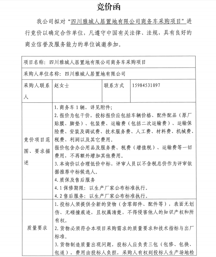 四川雅城人居置地有限公商務(wù)車采購項(xiàng)目競價(jià)公告