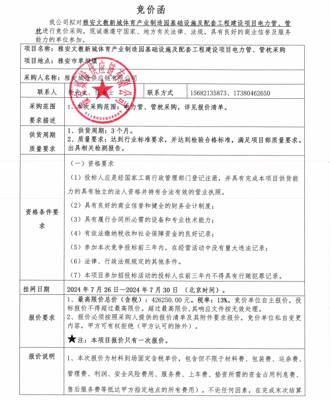 雅安文教新城體育產(chǎn)業(yè)制造園基礎(chǔ)設(shè)施及配套工程建設(shè)項(xiàng)目電力管、管枕采購(gòu)競(jìng)價(jià)公告