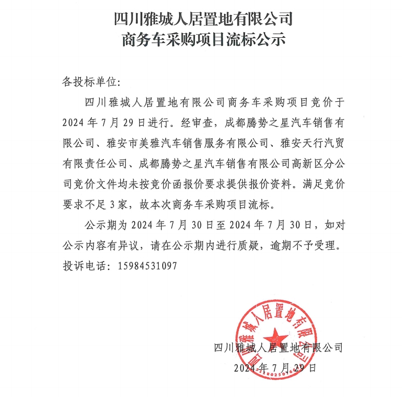 四川雅城人居置地有限公司商務車采購項目流標公示
