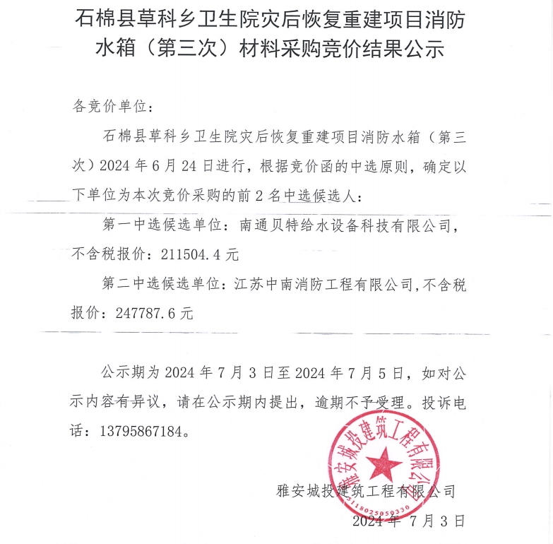 石棉縣草科鄉(xiāng)衛(wèi)生院災(zāi)后恢復(fù)重建項(xiàng)目消防水箱(第三次)材料采購競價(jià)結(jié)果公示