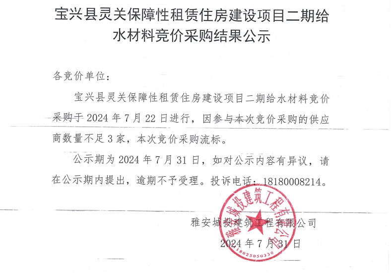 寶興縣靈關(guān)保障性租賃住房建設二期給水材料競價采購結(jié)果公示