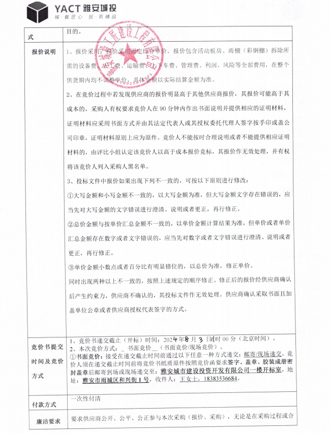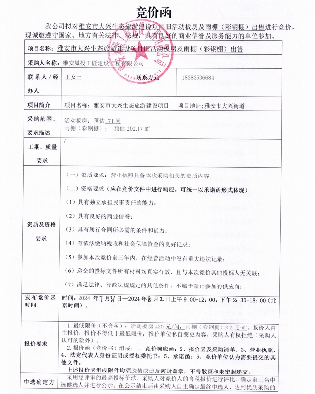 附件2:雅安市大興生態(tài)旅游建設(shè)項(xiàng)目舊活動板房出售競價(jià)函