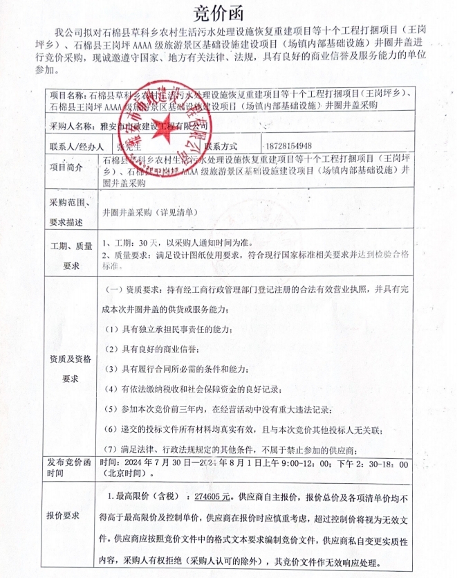 石棉縣草科鄉(xiāng)農(nóng)村生活污水處理設(shè)施恢復(fù)重建項(xiàng)目等十個(gè)工程打捆項(xiàng)目(王崗坪鄉(xiāng))、石棉縣王崗坪AAAA級(jí)旅游景區(qū)基礎(chǔ)設(shè)施建設(shè)項(xiàng)目(場(chǎng)鎮(zhèn)內(nèi)部基礎(chǔ)設(shè)施)井圈井蓋采購(gòu)競(jìng)價(jià)公告