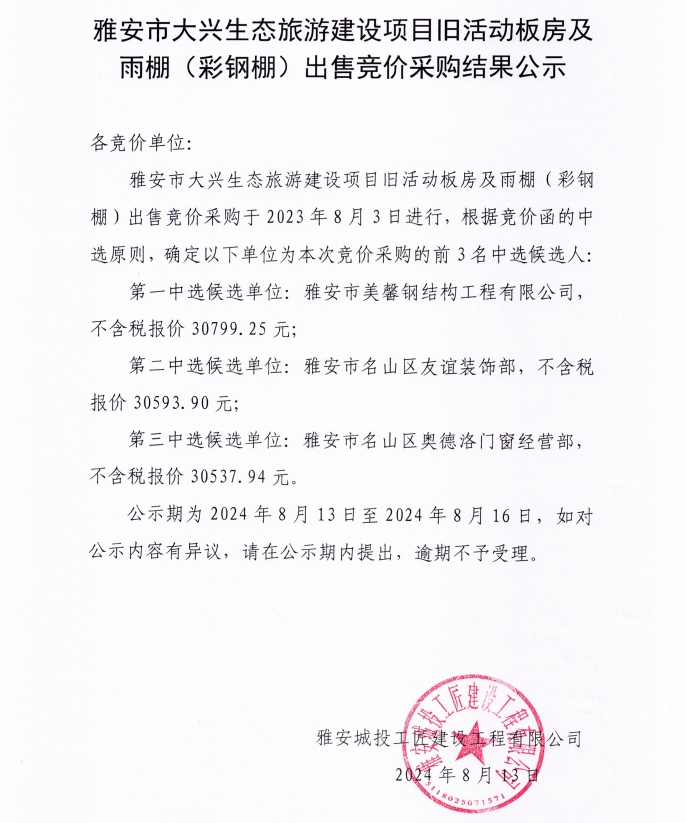 雅安市大興生態(tài)旅游建設項目舊活動板房及雨棚(彩鋼棚)出售競價采購結果公示