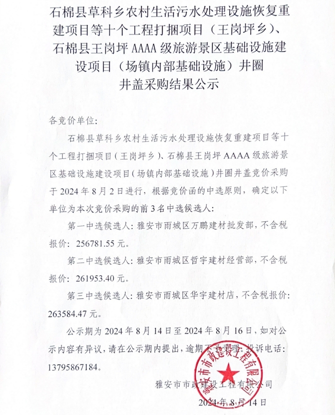 石棉縣草科鄉(xiāng)農(nóng)村生活污水處理設(shè)施恢復(fù)重建項(xiàng)目等十個(gè)工程打捆項(xiàng)目(王崗坪鄉(xiāng))、石棉縣王崗坪AAAA級旅游景區(qū)基礎(chǔ)設(shè)施建設(shè)項(xiàng)目(場鎮(zhèn)內(nèi)部基礎(chǔ)設(shè)施)井圈井蓋采購結(jié)果公示