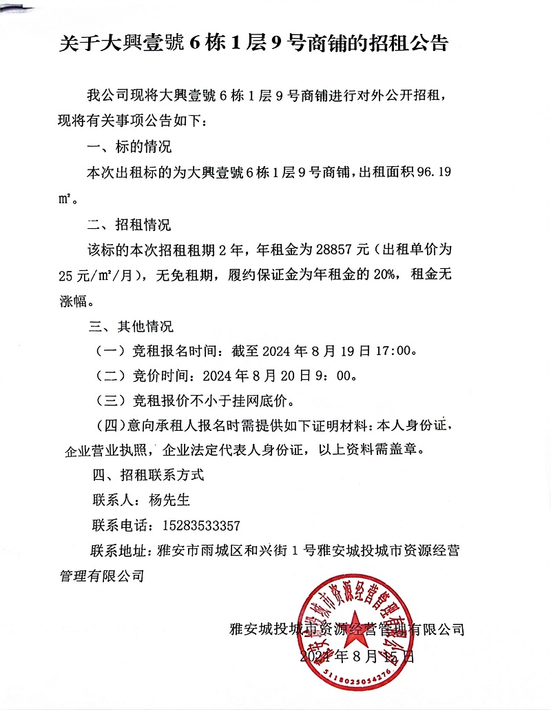 關于大興壹號6棟1層9號商鋪的招租公告