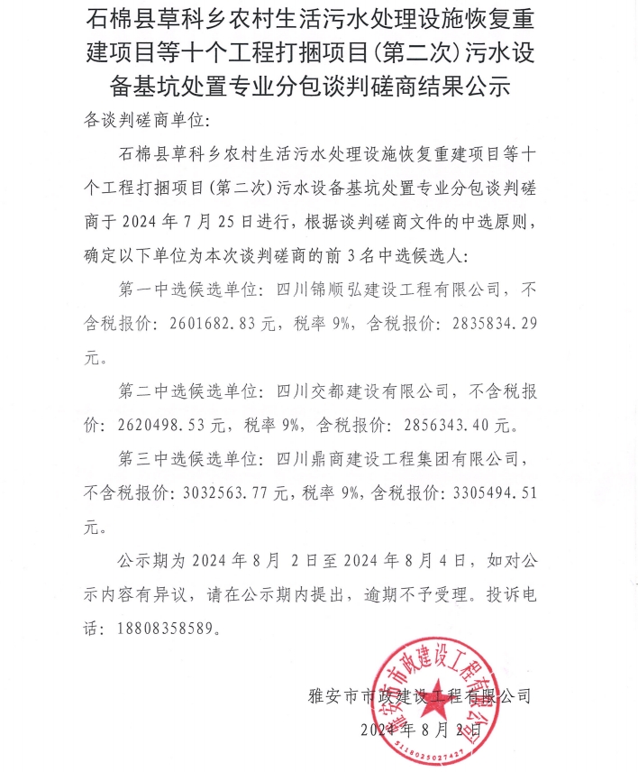 石棉縣草科鄉(xiāng)農村生活污水處理設施恢復重建項目等十個工程打捆項目(第二次) 污水設備基坑處置專業(yè)分包談判磋商結果公示