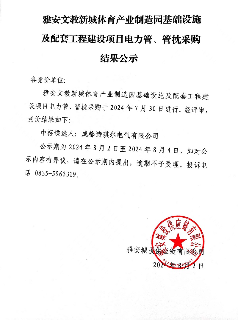 雅安文教新城體育產(chǎn)業(yè)制造園基礎(chǔ)設(shè)施及配套工程建設(shè)項(xiàng)目電力管、管枕采購結(jié)果公示