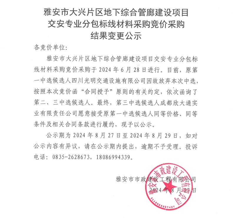 雅安市大興片區(qū)地下綜合管廊建設(shè)項(xiàng)目交安專業(yè)分包標(biāo)線材料采購競(jìng)價(jià)采購結(jié)果變更公示