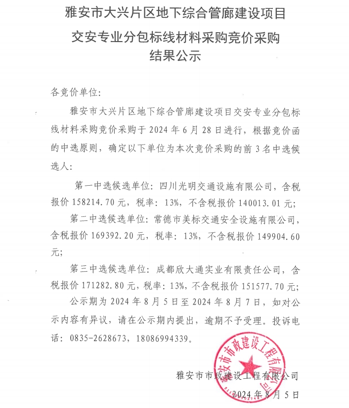 雅安市大興片區(qū)地下綜合管廊建設(shè)項(xiàng)目道路專業(yè)分包標(biāo)線材料采購競價(jià)采購結(jié)果公示