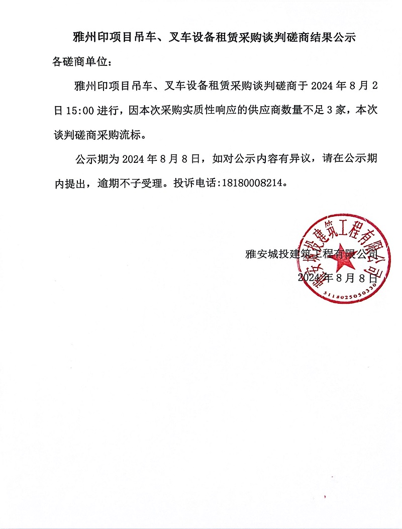雅州印項(xiàng)目吊車、叉車設(shè)備租賃采購談判磋商結(jié)果公示