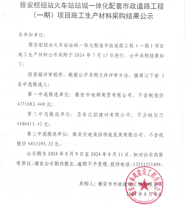 雅安樞紐站火車站站城一體化配套市政道路工程(一期)項目施工生產材料采購結果公示