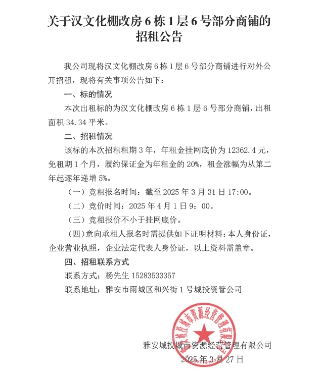 關(guān)于漢文化棚改房6棟1層6號(hào)部分商鋪的招租公告