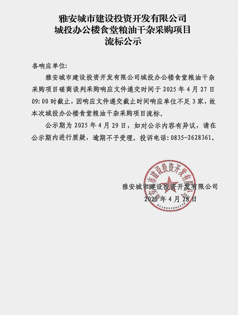 雅安城市建設(shè)投資開發(fā)有限公司辦公樓食堂干雜采購(gòu)項(xiàng)目流標(biāo)公示