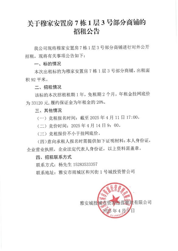 關(guān)于穆家安置房7棟1層3號(hào)部分商鋪的招租公告