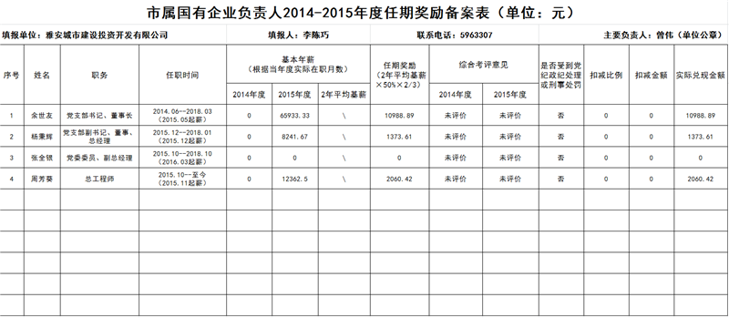 市屬國有企業(yè)負責人2014-2015年度任期獎勵備案表
