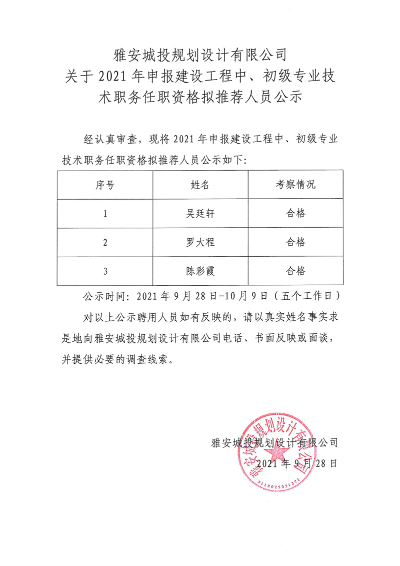 雅安城投規(guī)劃設(shè)計(jì)有限公司關(guān)于2021年申報(bào)建設(shè)工程中、初級(jí)專業(yè)技術(shù)職務(wù)任職資格擬推薦人員公示