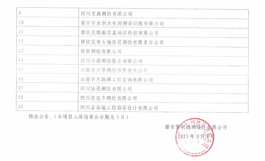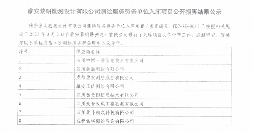 雅安黎明勘測設(shè)計有限公司測繪服務(wù)勞務(wù)單位入庫項目公開招募結(jié)果公示