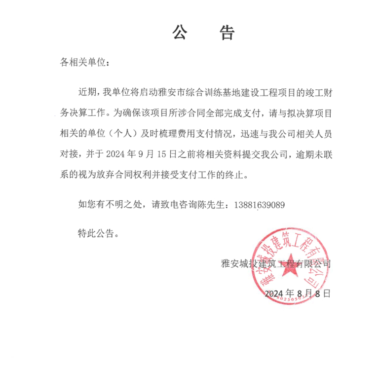 雅安市綜合訓(xùn)練基地建設(shè)項(xiàng)目決算公告