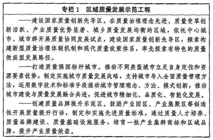 (九)打造區(qū)域質(zhì)量發(fā)展新優(yōu)勢(shì)。加強(qiáng)質(zhì)量政策引導(dǎo),推動(dòng)區(qū)域質(zhì)量發(fā)展與生產(chǎn)力布局、區(qū)位優(yōu)勢(shì)、環(huán)境承載能力及社會(huì)發(fā)展需求對(duì)接融合。推動(dòng)?xùn)|部地區(qū)發(fā)揮質(zhì)量變革創(chuàng)新的引領(lǐng)帶動(dòng)作用,增強(qiáng)質(zhì)量競(jìng)爭(zhēng)新優(yōu)勢(shì),實(shí)現(xiàn)整體質(zhì)量提升。引導(dǎo)中西部地區(qū)因地制宜發(fā)展特色產(chǎn)業(yè),促進(jìn)區(qū)域內(nèi)支柱產(chǎn)業(yè)質(zhì)量升級(jí),培育形成質(zhì)量發(fā)展比較優(yōu)勢(shì)。推動(dòng)?xùn)|北地區(qū)優(yōu)化質(zhì)量發(fā)展環(huán)境,加快新舊動(dòng)能轉(zhuǎn)換,促進(jìn)產(chǎn)業(yè)改造升級(jí)和質(zhì)量振興。健全區(qū)域質(zhì)量合作互助機(jī)制,推動(dòng)區(qū)域質(zhì)量協(xié)同發(fā)展。深化質(zhì)量強(qiáng)省建設(shè),推動(dòng)質(zhì)量強(qiáng)市、質(zhì)量強(qiáng)業(yè)向縱深發(fā)展,打造質(zhì)量強(qiáng)國(guó)建設(shè)標(biāo)桿。